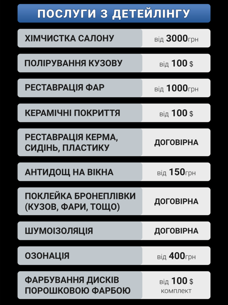 СТУДІЯ ДЕТЕЙЛІНГУ КОНТАКТИ Зателефонуйте нам, щоб отримати послуги якнайшвидше! тел: +063 60 60 470 Місто Рівне, вул. Володимира Стельмаха 3 Наші соцмережі Tiktok Instagram Facebook Telegram